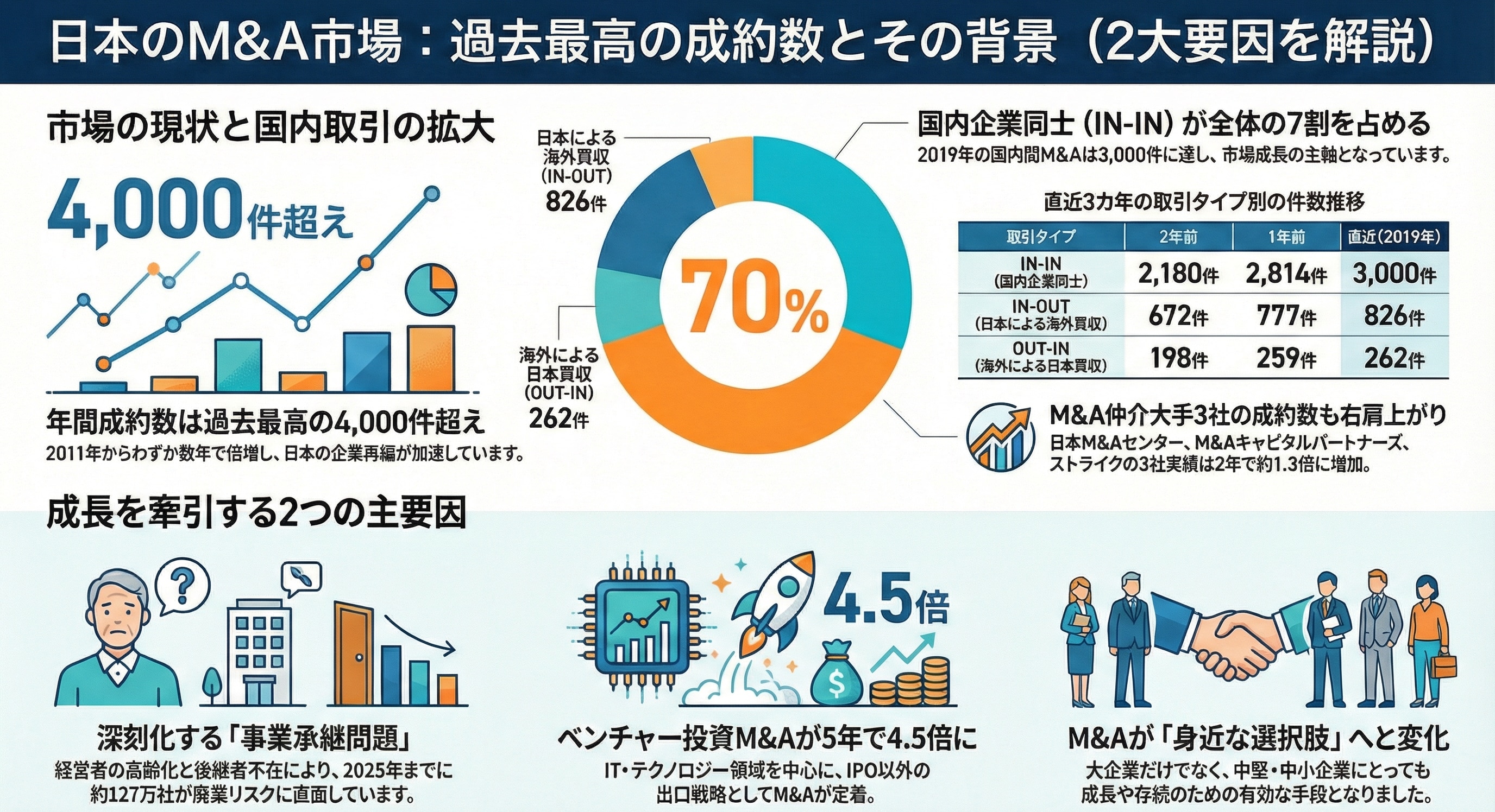 ディールの規模(金額)は当然ながら大企業同士のM&Aが大きくなりますが、件数増加の背景は、中堅・中小企業のM&Aが活発化していることに起因しています。そしてその理由として挙げられるのが、