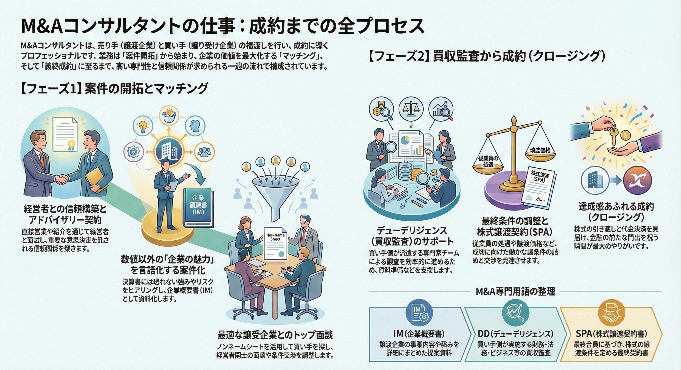 非常にきめ細やかな対応が求められ、且つ並行して案件が進むために、M&Aコンサルタントの仕事は、"ハードワーク"と言われますが、株式譲渡契約書の調印の瞬間に立ち会えること、新たな門出を祝える瞬間に立ち会える達成感と喜びは、この仕事のやりがいを十二分に感じられる瞬間ではないかと思います。